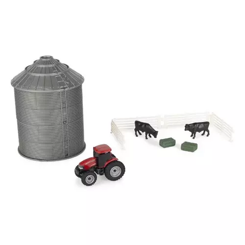 Great add to your farm! ERTL Mini Grain Bin Set with Tractor! This 10 piece grain bin set includes a grain bin and tractor, 2 cows, 2 bales and a fence. Ages 3+