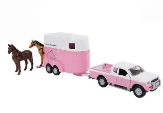 Add to your horse collection! Get this set, and transport your horses to the next horse show!  Kids Globe, die-cast metal Mitsubishi Truck and horse transport!  Pull-back action, doors open. Horses included.